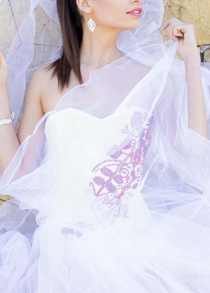 El Vestido modelo “SALOME”, incluye bordado floral lame, silueta princesa