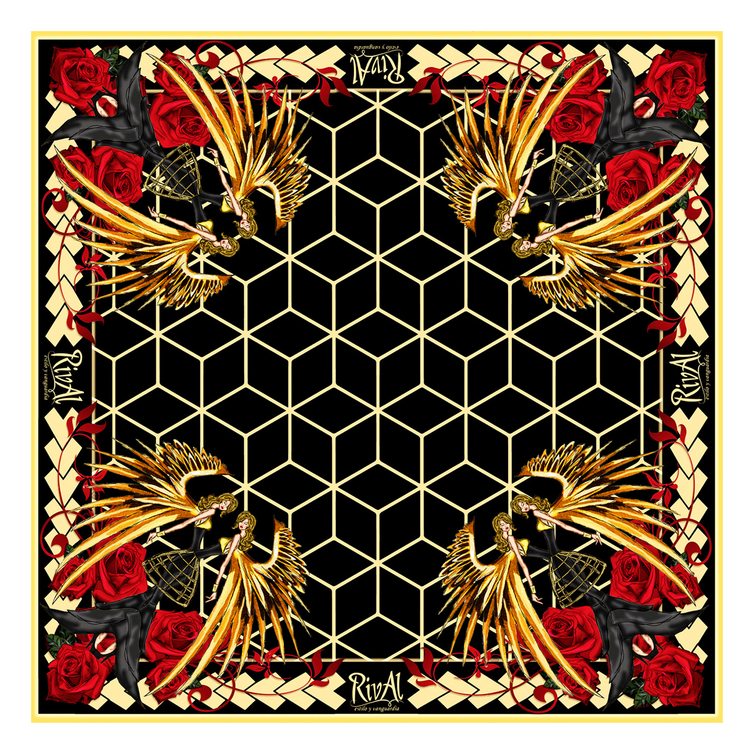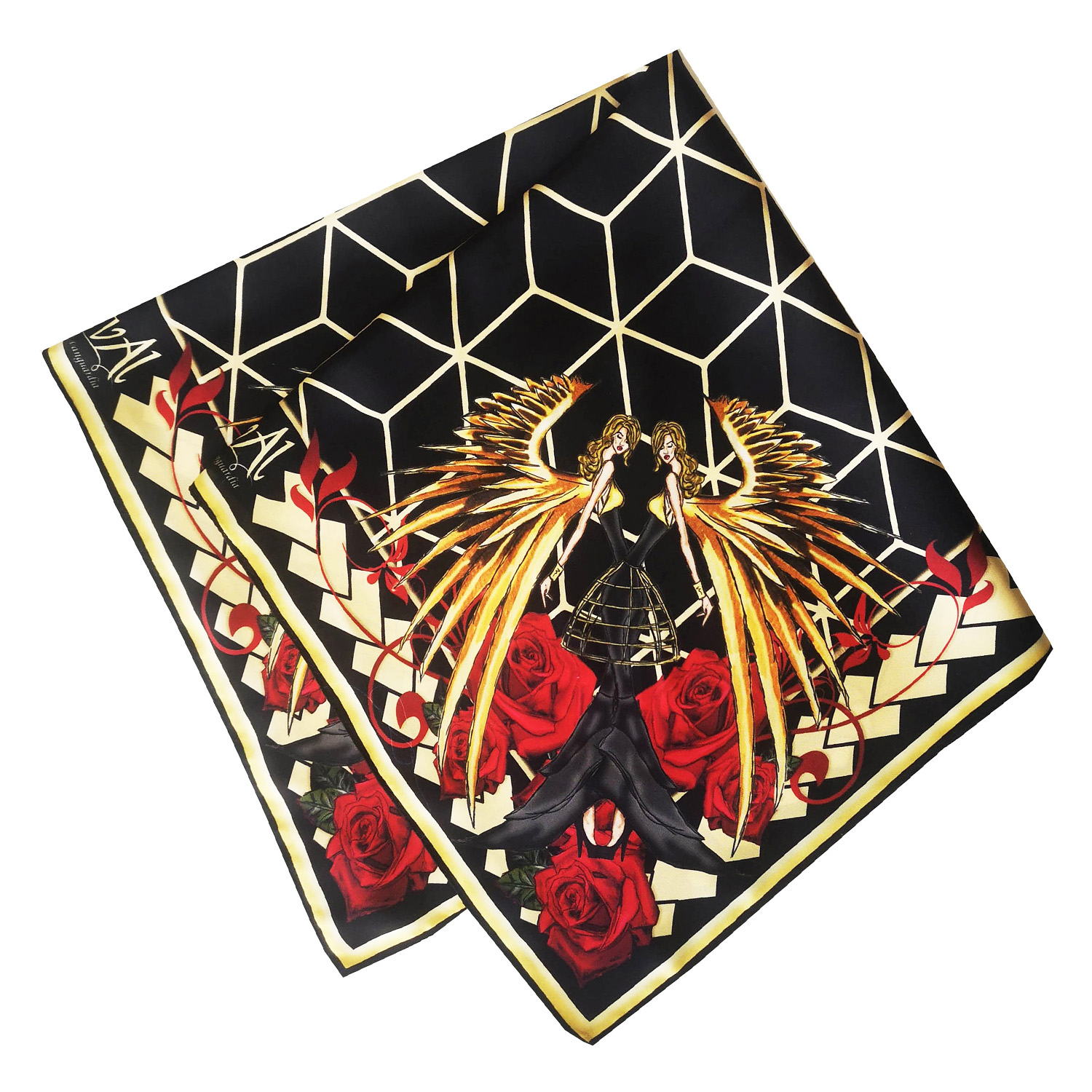 Pañuelo estampado estilo Geometrico, con Angeles gemelos y rosas, logotipo en detalle borde.