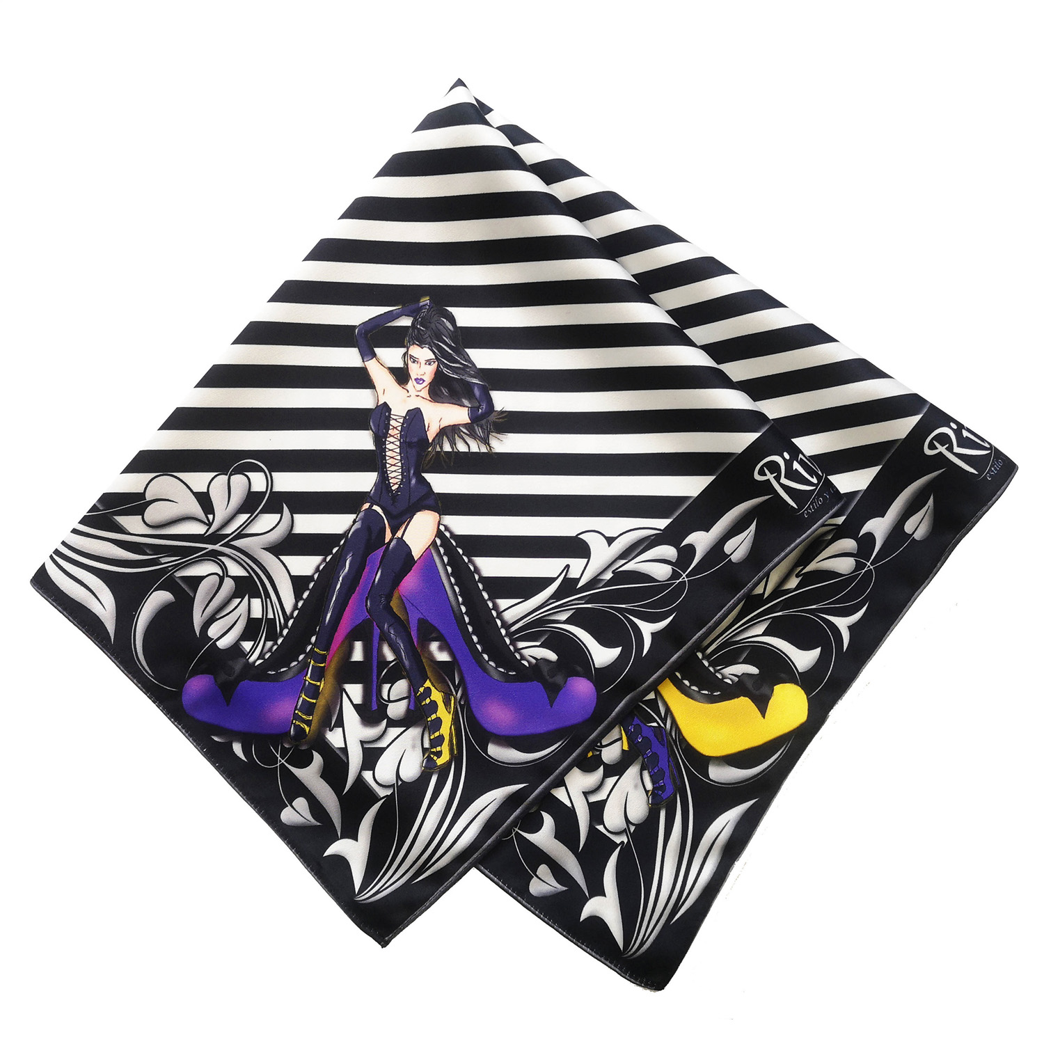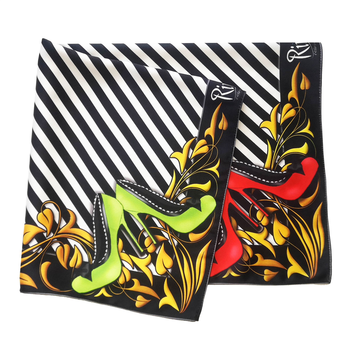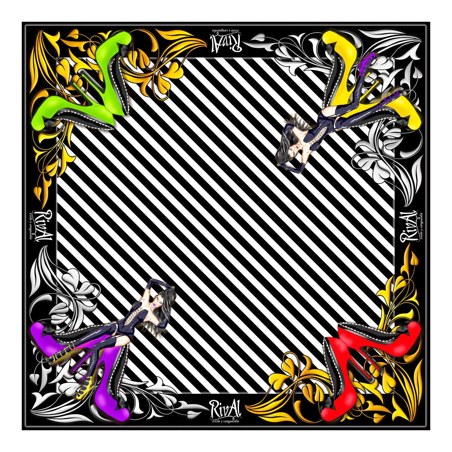 Pañuelo Estampado listado, con ilustracion Isa Shoes, logotipo en detalle borde.