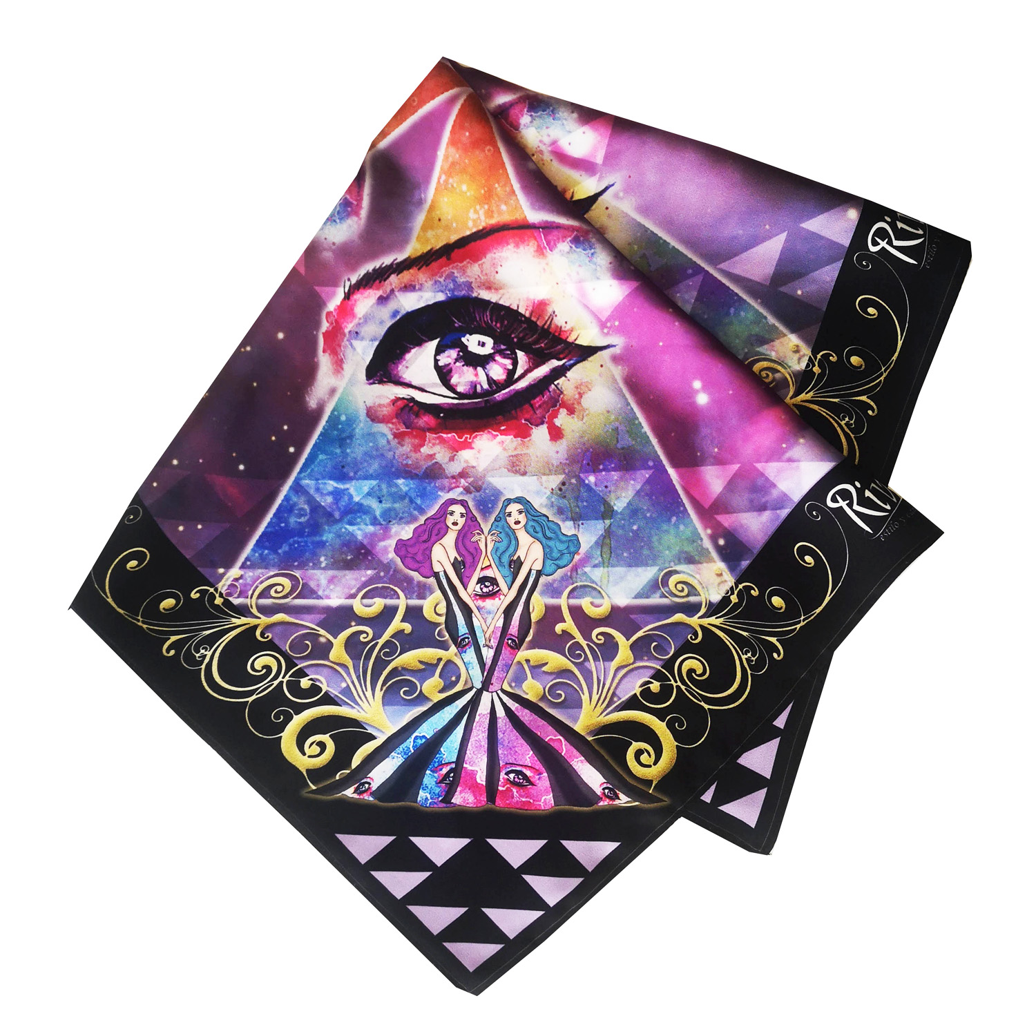 Pañuelo Estampado estilo mistico, ilustracion Gemelas videntes, logotipo en detalle borde.