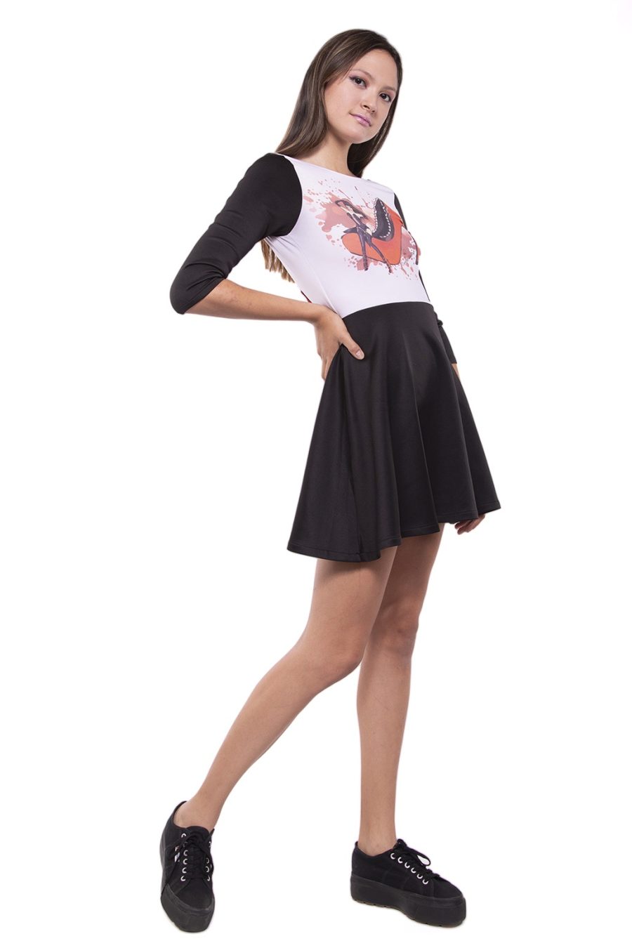 El Vestido modelo “FRANISA SHOE”, incluye estampado ilustracion, escote alto, silueta tipo A.